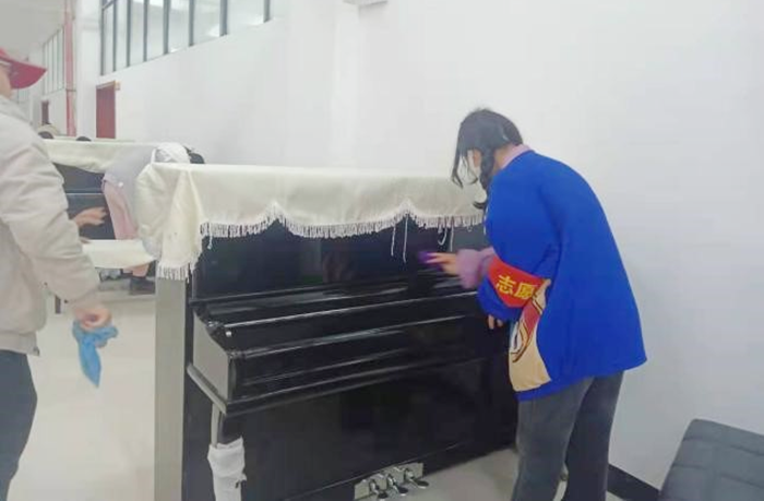 此次活动主要的清扫区域为食堂一楼的音乐教育学院琴房。活动中,志愿者们面带笑容、干劲十足,对琴房的每个角落认真清理,仔细擦拭了每台钢琴。他们相互协助,经过一个多小时的辛勤劳动,钢琴房环境变得干净整洁,整齐有序。
