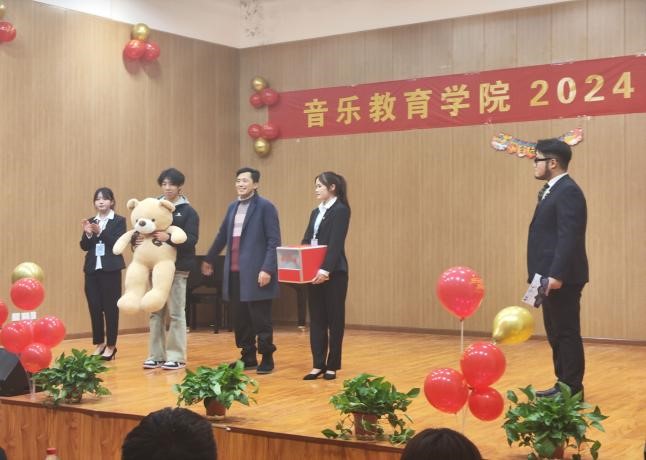 为丰富学生的文化生活,营造欢乐、喜庆的元旦佳节氛围,12月27日,音乐教育学院师生欢聚一堂,在实训楼音乐舞蹈厅隆重举行了2024年元旦晚会。本次晚会邀请了校党委委员、音乐教育学院院长沈春雷,音乐教育学院党支部书记陈小虎,音乐教育学院教学助理水九清,音乐教研室主任吴乾康以及音乐教育学院辅导员及专业课老师。