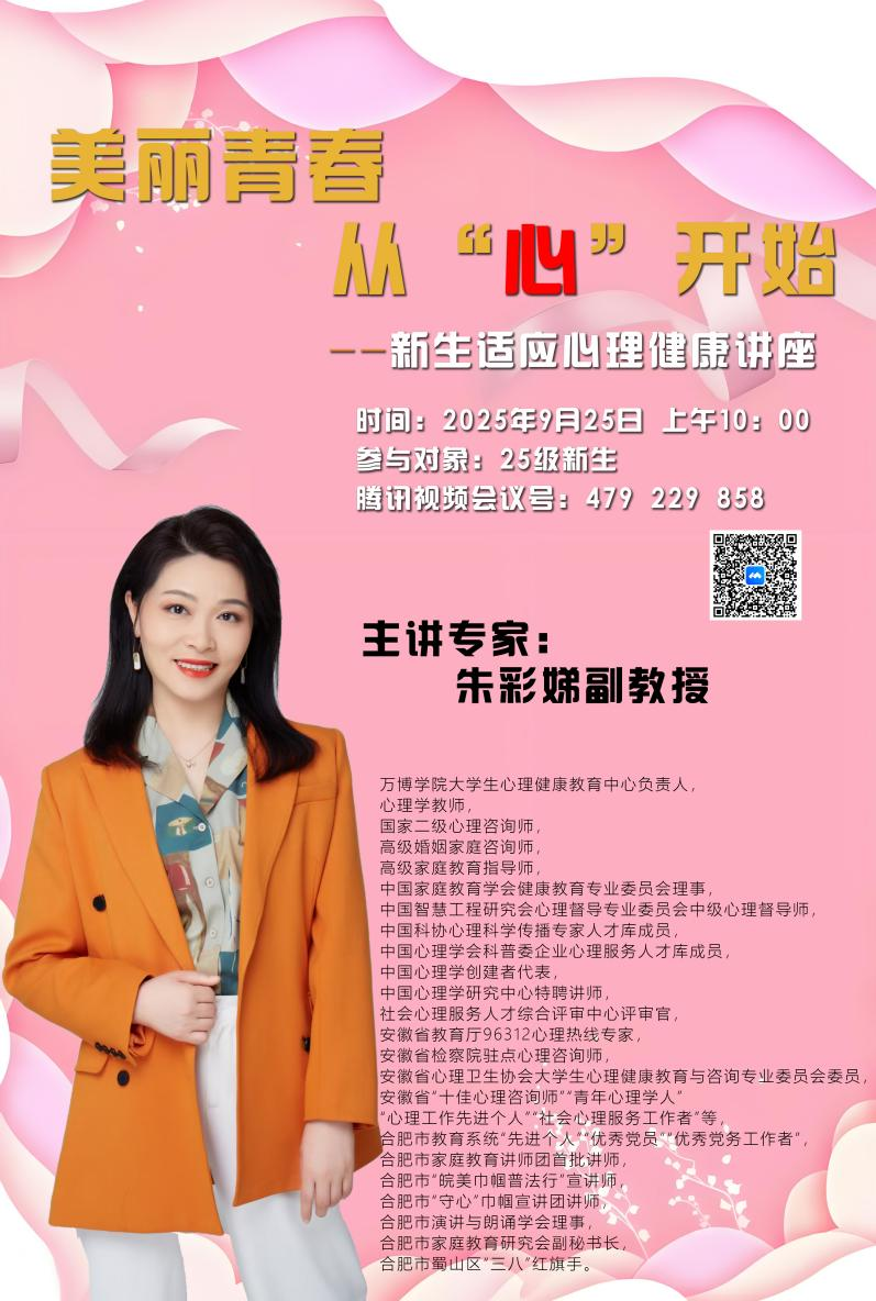 为帮助大家更好地适应大学生活,完成角色转变,我校大学生心理健康指导中心负责人朱彩娣老师将于2025年9月25日(周四)10:00,开展主题为美丽青春从“心”开始,新生适应心理健康讲座,助力新生更好地适应大学生活。