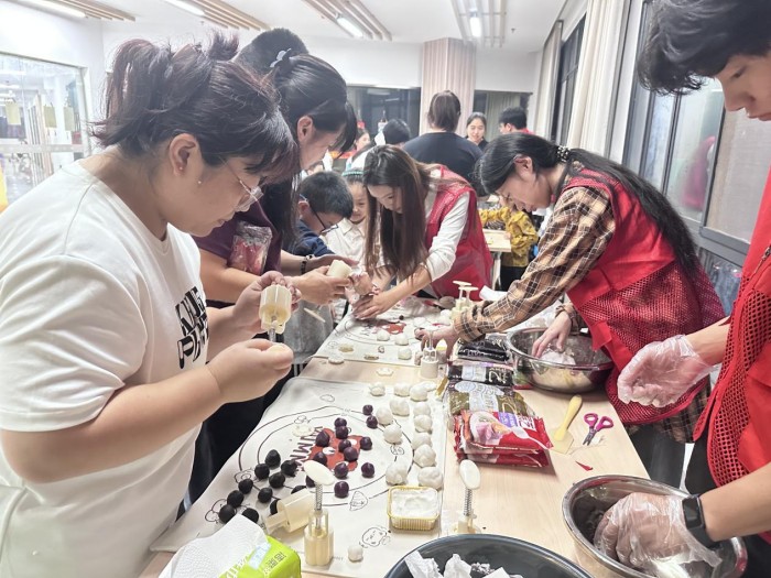 活动现场气氛热烈,洋溢着浓厚的中秋佳节氛围。在志愿者的引导与协助下,居民们踊跃参与各项活动。桂花酿手作区内,大家将新鲜桂花与米酒巧妙融合,亲手封存下一罐罐秋日风味,在桂香与酒意中感受传统饮食文化的魅力;灯笼制作区里,一盏盏精巧的灯笼逐渐在居民手中成型,点亮了节日的温馨;月饼制作区中,大家有条不紊地揉面、包馅、压模,制作出造型各异、口味丰富的月饼,在实践中体会传统民俗的乐趣。