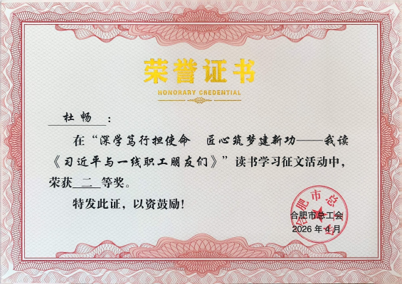 马克思主义学院教师杜畅荣获合肥市总工会读书征文二等奖为大力弘扬劳模精神、劳动精神和工匠精神,合肥市总工会于2026年开展庆“五一”系列主题活动。万博科技职业学院工会迅